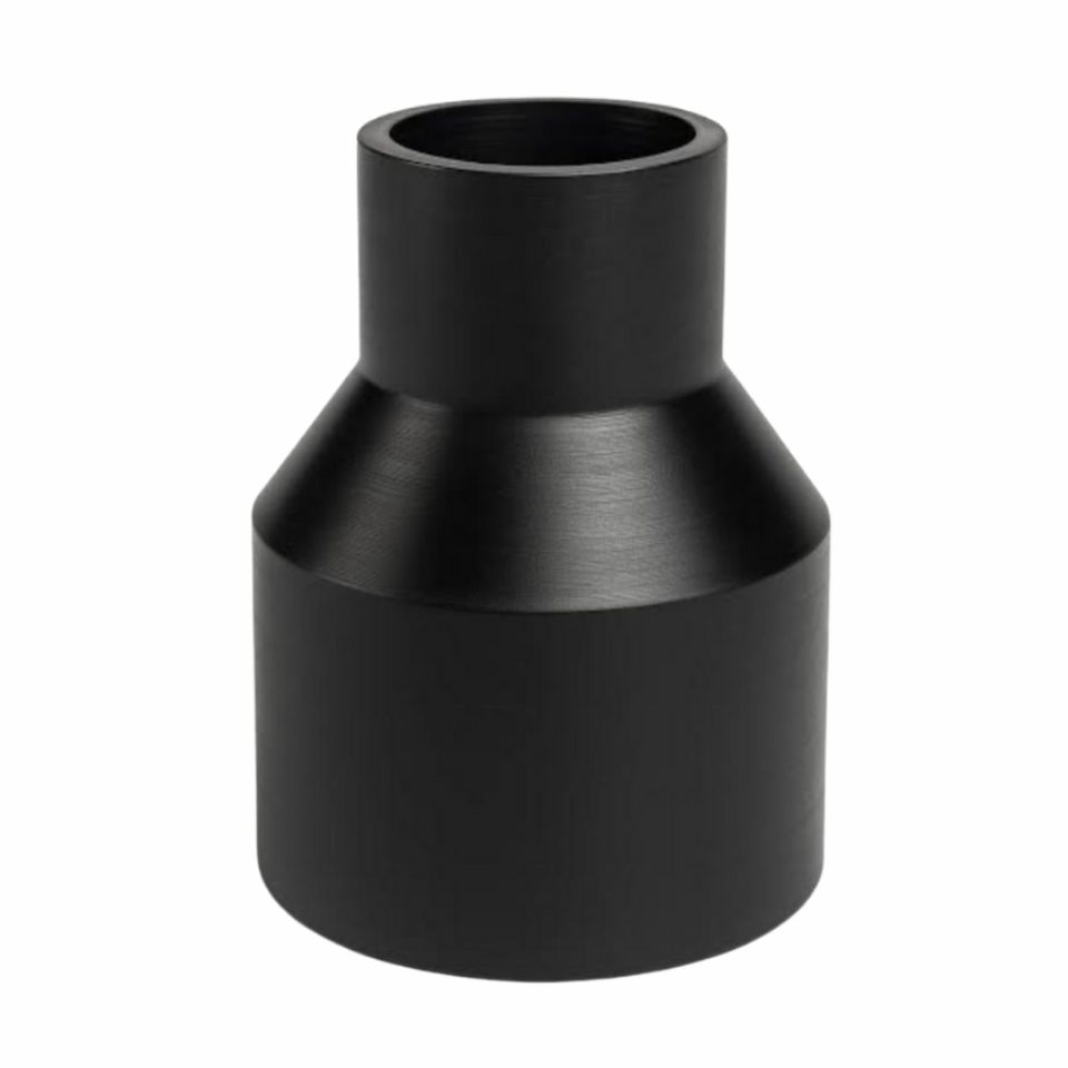 Cupla de reducción, moldeada por inyección en Polietileno de Alta Densidad (HDPE), diseñada para la unión lineal de dos tuberías de diferentes diámetros, asegurando una transición suave y segura en redes de alta presión con requerimiento SDR 11.