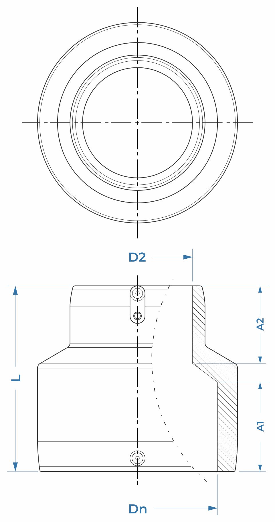 Cupla de reducción, moldeada por inyección en Polietileno de Alta Densidad (HDPE), diseñada para la unión lineal de dos tuberías de diferentes diámetros, asegurando una transición suave y segura en redes de alta presión con requerimiento SDR 11.