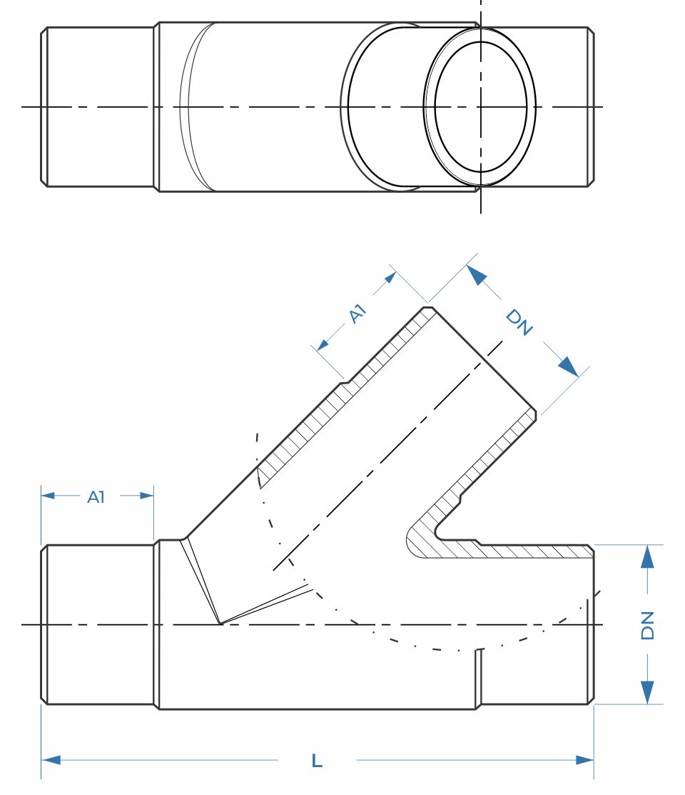 Tee a 45°, moldeado por inyección en Polietileno de Alta Densidad (HDPE), diseñado para crear derivaciones laterales con un ángulo de 45° para optimizar la hidrodinámica en redes de tuberías de alta presión con requerimiento SDR 11.