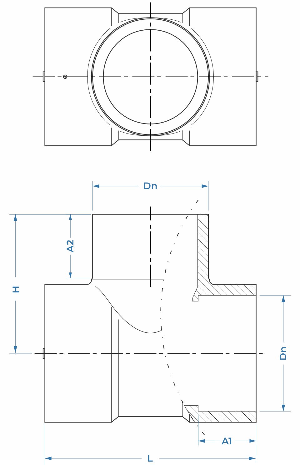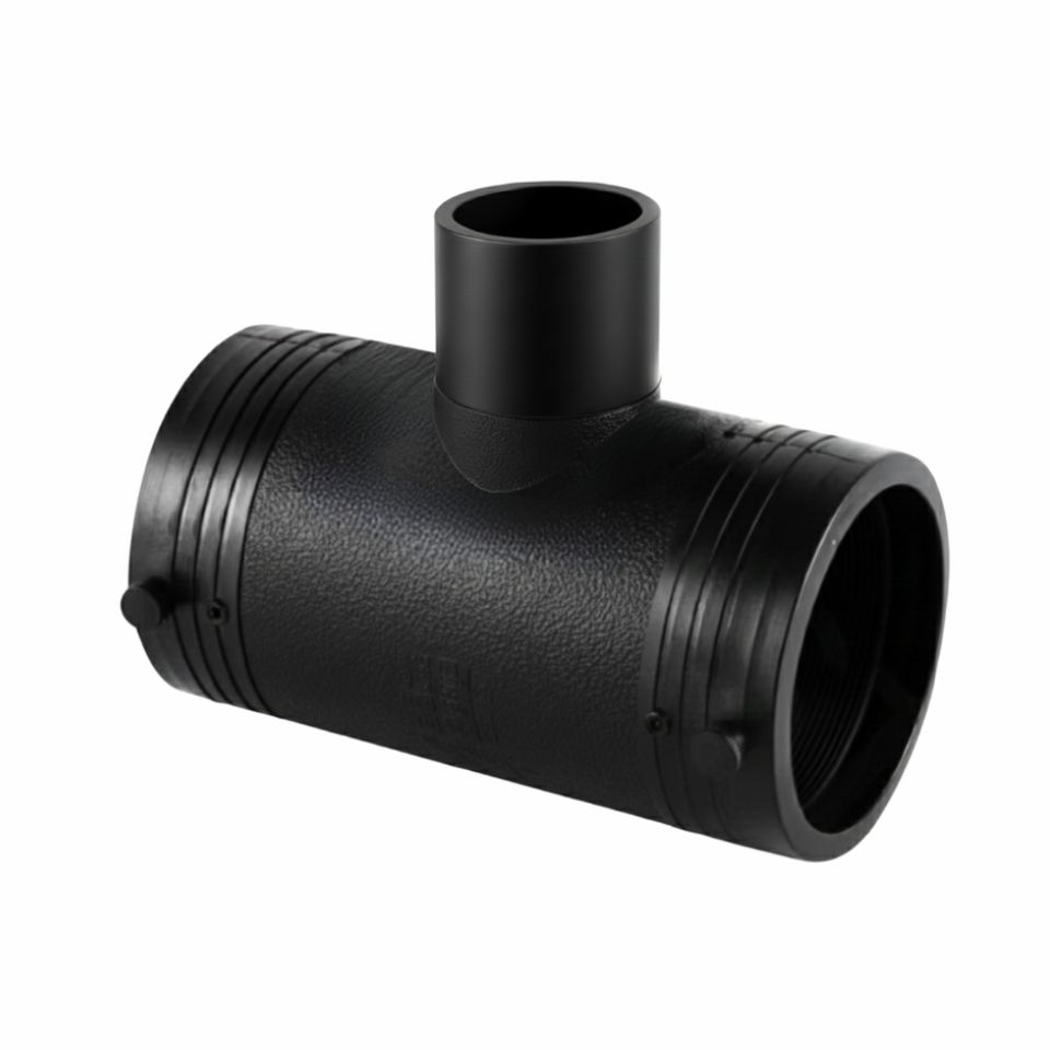 Unión en TEE con reducción, moldeada por inyección en Polietileno de Alta Densidad (HDPE), diseñada para crear una derivación a 90° de menor diámetro que la línea principal, en redes de tuberías de alta presión con requerimiento SDR 11.